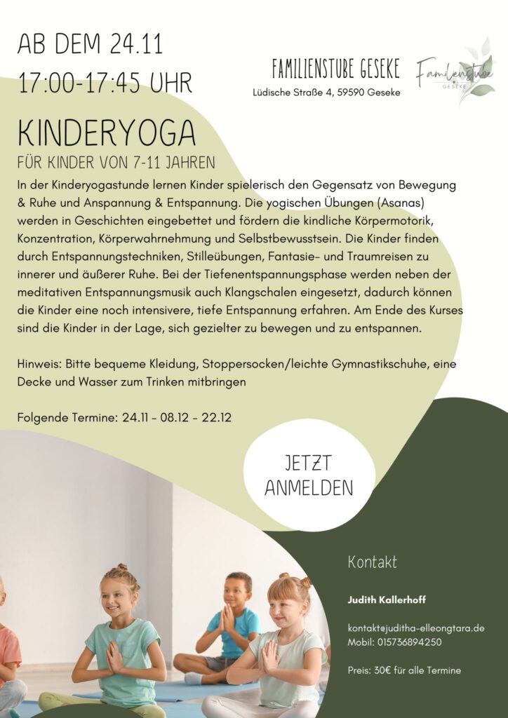 • Kinderyogageschichte vorlesen (aus versch. Büchern, selbstgeschrieben oder die Kinder erfinden zusammen eine Geschichte. Das Thema kann z.B. sein: „Ein Ausflug auf dem Bauernhof“, „Wir gehen auf die Kirmes“, „Im Zirkus“, „Am Strand“, „Im Wald“, „Auf der Wiese“, uvm.